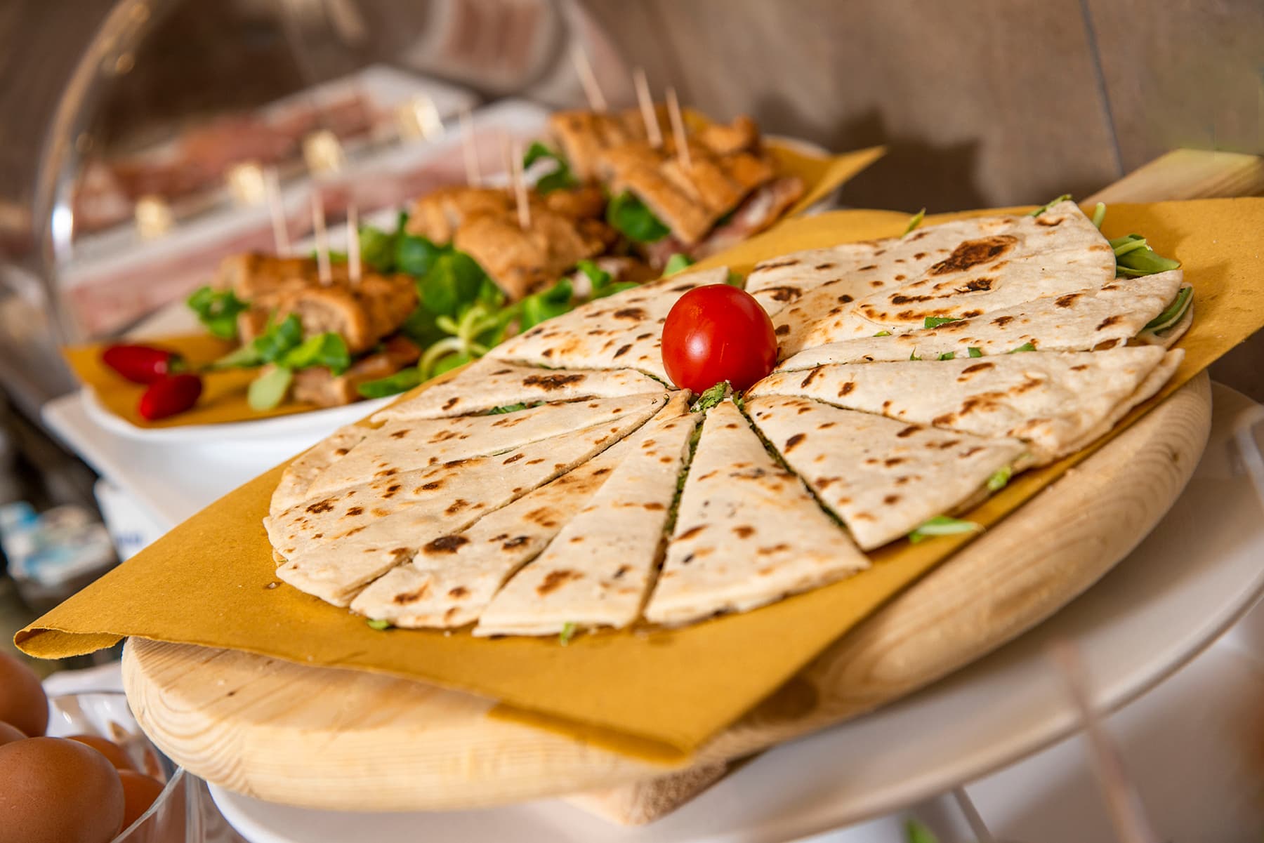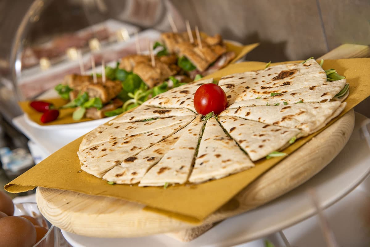 Questa terra generosa ci ispira ricette che seguono i ritmi delle stagioni e, quando possibile, attingono da materie prime locali. Prediligiamo il km0, quello vero, che non è il fornitore grossista più comodo da raggiungere, ma il produttore locale fidato, la filiera corta che nasce e cresce in un raggio di pochi km. Ecco perché non sempre trovi le fragole, i carciofi li cuciniamo fino a fine giugno, mentre in luglio e agosto è il momento delle torte a base di pesche e albicocche, e dei pomodori più succosi preparati in mille maniere. Quella che invece trovi sempre è lei, la piadina, che davvero non può mancare. A Rimini la facciamo morbida e sottile – ma basta allungarsi poco più a nord e diventa più alta e spessa, ugualmente buona.